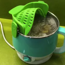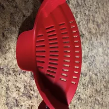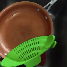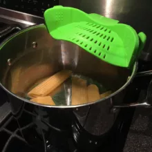 This makes it so much easier to dump out water when making pasta of any type. Fits very well to most sized pans and dishwasher safe. My 9 yr old granddaughter can now dump the water out of the Mac and cheese easily. This is a must have for people who make Pastas of any kind that require dumping out hot water. It is made out of a type of rubber so I’m not sure if I would use it for hot grease, but it may be ok for that too since a lot of spatulas etc are made from similar material